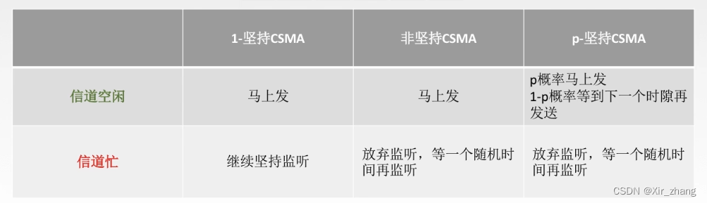 ②空闲则以p概率直接传输,不必等待,概率1-p等待到下一个时间槽再传输。