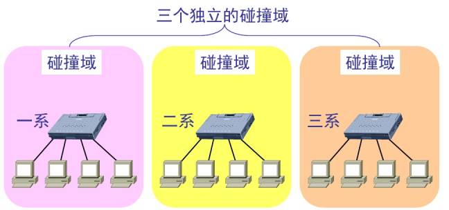 每个以太网都是一个独立的碰撞域(又称冲突域),也就是在任意时刻只能有个站发送数据。通过集线器把三个以太网连接在一起,他们的最大吞吐量和一个以太网的吞吐量仍然不会变。不同的碰撞域使用不同的数据率,就不能用集线器将它们互连起来。集线器是个多接口的转发器,并不能把帧进行缓存。