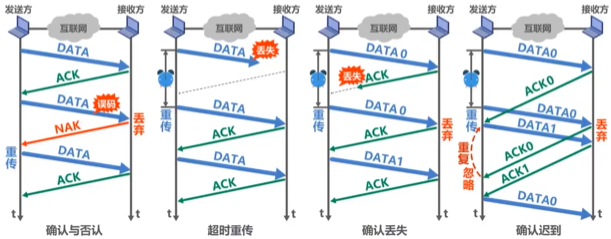 接收端检测到数据分组有误码时,将其丢弃并等待发送方的超时重传。但对于误码率较高的点对点链路,为使发送方尽早重传,也可给发送方发送NAK分组。为了让接收方能够判断所收到的数据分组是否是重复的,需要给数据分组编号。由于停止-等待协议的停等特性,只需1个比特编号就够了,即编号0和1。为了让发送方能够判断所收到的ACK分组是否是重复的,需要给ACK分组编号,所用比特数量与数据分组编号所用比特数量一样。 数据链路层般不会出现ACK分组迟到的情况,为了让发送方能够判断所收到的ACK分组是否是重复的,需要给ACK分组编号,所用比特数量与数据分组编号所用比特数量一样。