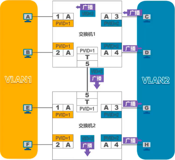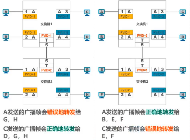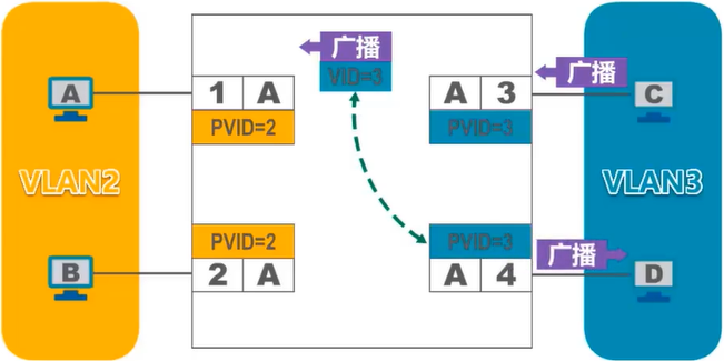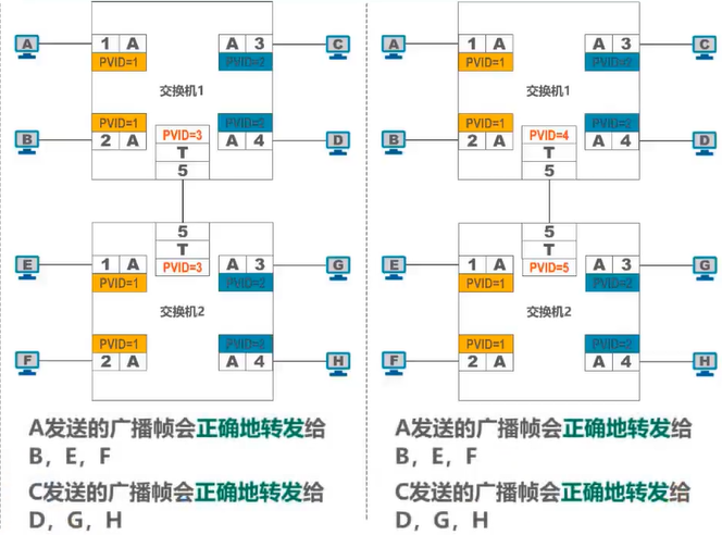 Trunk端口发送处理方法:对VID等于PVID的帧,“去标签”转发;对VID不等于PVID的帧,直接转发。