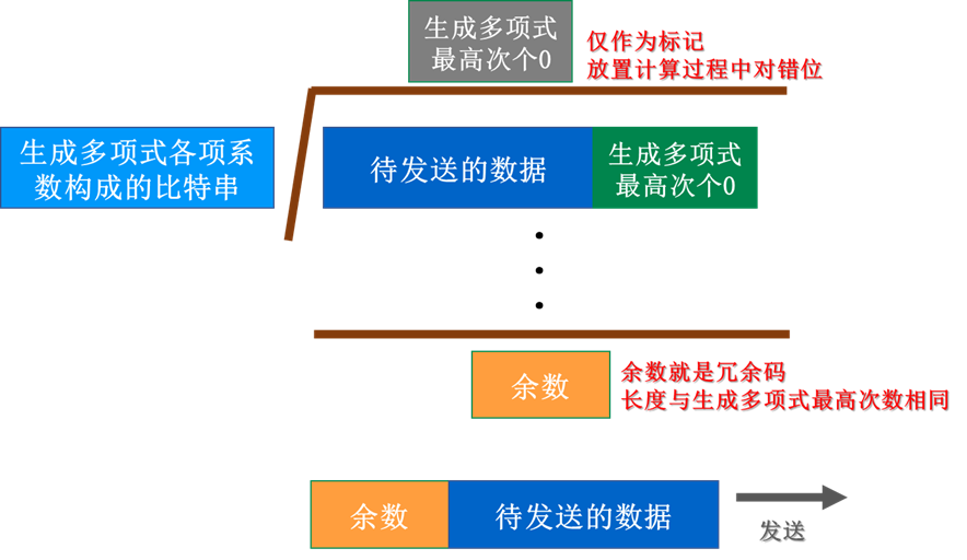 收发双方约定好一个生成多项式G(x);发送方基于待发送的数据和生成多项式计算出差错检测码(冗余码),将其添加到待传输数据的后面一起传输;接收方通过生成多项式来计算收到的数据是否产生了误码。