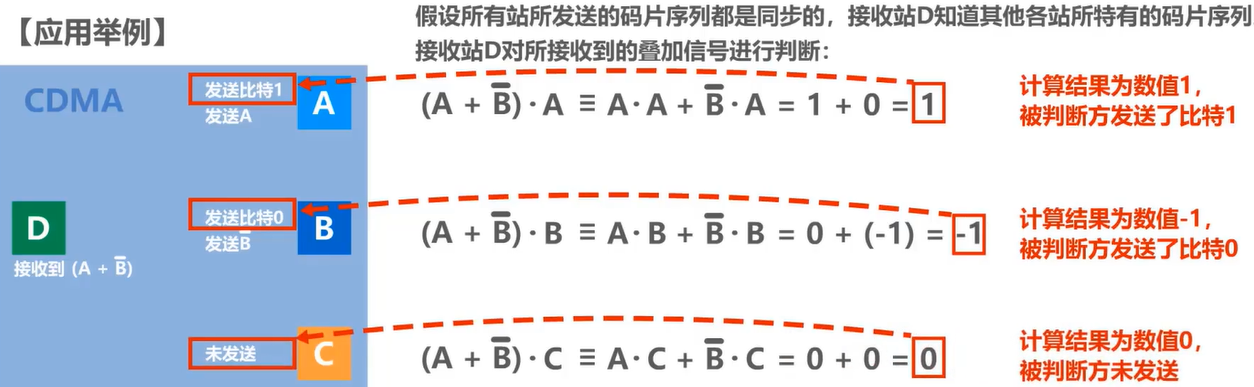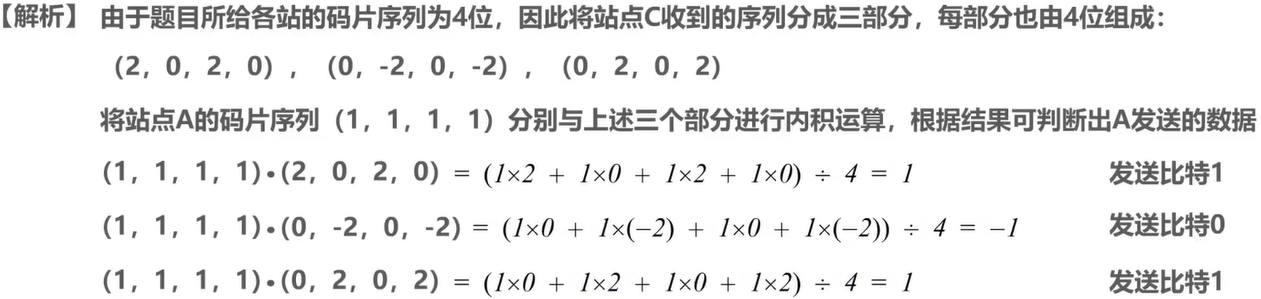 令向量S表示站S的码片序列,令向量T表示其他任何站的码片序列。两个不同站S和T的码片序列正交,就是向量S和T的规格化内积为0:,