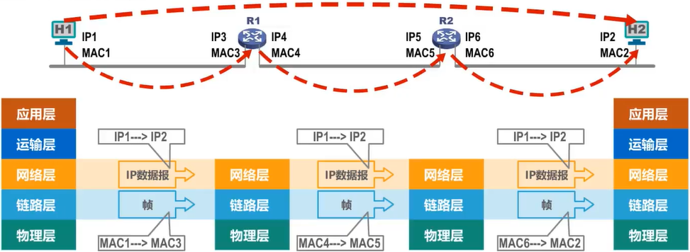 数据包转发过程中源MAC地址和目的MAC地址逐个链路(或逐个网络)改变。