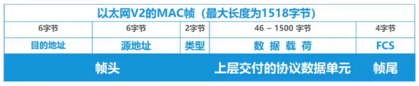 目的MAC地址(6字节)+ 源MAC地址(6字节)+ 类型(2字节)+ 数据载荷(46~1500字节)+ FCS(4字节)