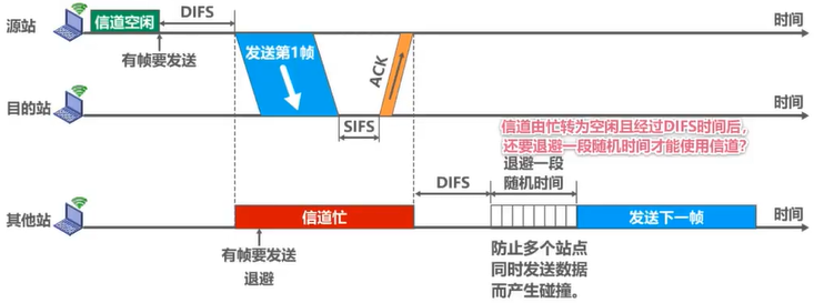 802.11标准规定,所有的站点必须在持续检测到信道空闲一段指定时间后才能发送帧,这段时间称为帧间间隔IFS。帧间间隔的长短取决于该站点要发送的帧的类型:高优先级帧需要等待的时间较短,因此可优先获得发送权;低优先级帧需要等待的时间较长。若某个站的低优先级帧还没来得及发送,而其他站的高优先级帧已发送到信道上,则信道变为忙态,因而低优先级帧就只能再推迟发送了。这样就减少了发生碰撞的机会。