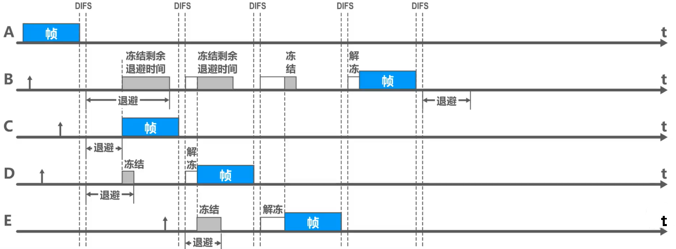 当退避计时器的时间减小到零时,就开始发送数据;当退避计时器的时间还未减小到零时而信道又转变为忙状态,这时就冻结退避计时器的数值,重新等待信道变为空闲,再经过时间DIFS后,继续启动退避计时器。