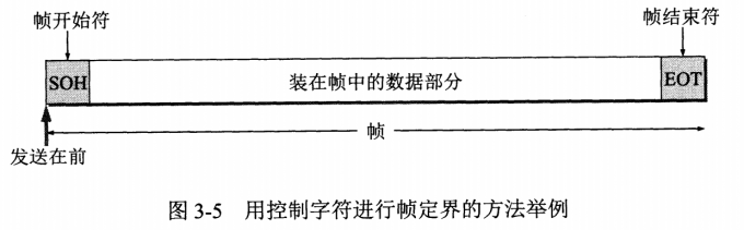 一个帧的帧长等于帧的数据部分长度加上帧首部和帧尾部的长度。首部和尾部的一个重要作用就是进行帧定界(即确定帧的界限)。当数据是由可打印的ASCII码组成的文本文件时,帧定界可以使用特殊的帧定界符。我们知道,ASCII码是7位编码,一共可组合成128个不同的ASCII码,其中可打印的有95个,而不可打印的控制字符有33个。下图的例子可说明帧定界的概念。控制字符SOH (Start Of Header)放在一帧的最前面,表示帧的首部开始。另一个控制字符EOT (End Of Transmission)表示帧的结束。请注意,SOH和EOT都是控制字符的名称。它们的十六进制编码分别是01(二进制是00000001)和04(二进制是00000100)。SOH(或EOT)并不是S, O, H(或E, O, T)三个字符。由于使用了帧定界符,接收端就知道前面收到的数据是否是个不完整的帧,进而判定是否丢弃。