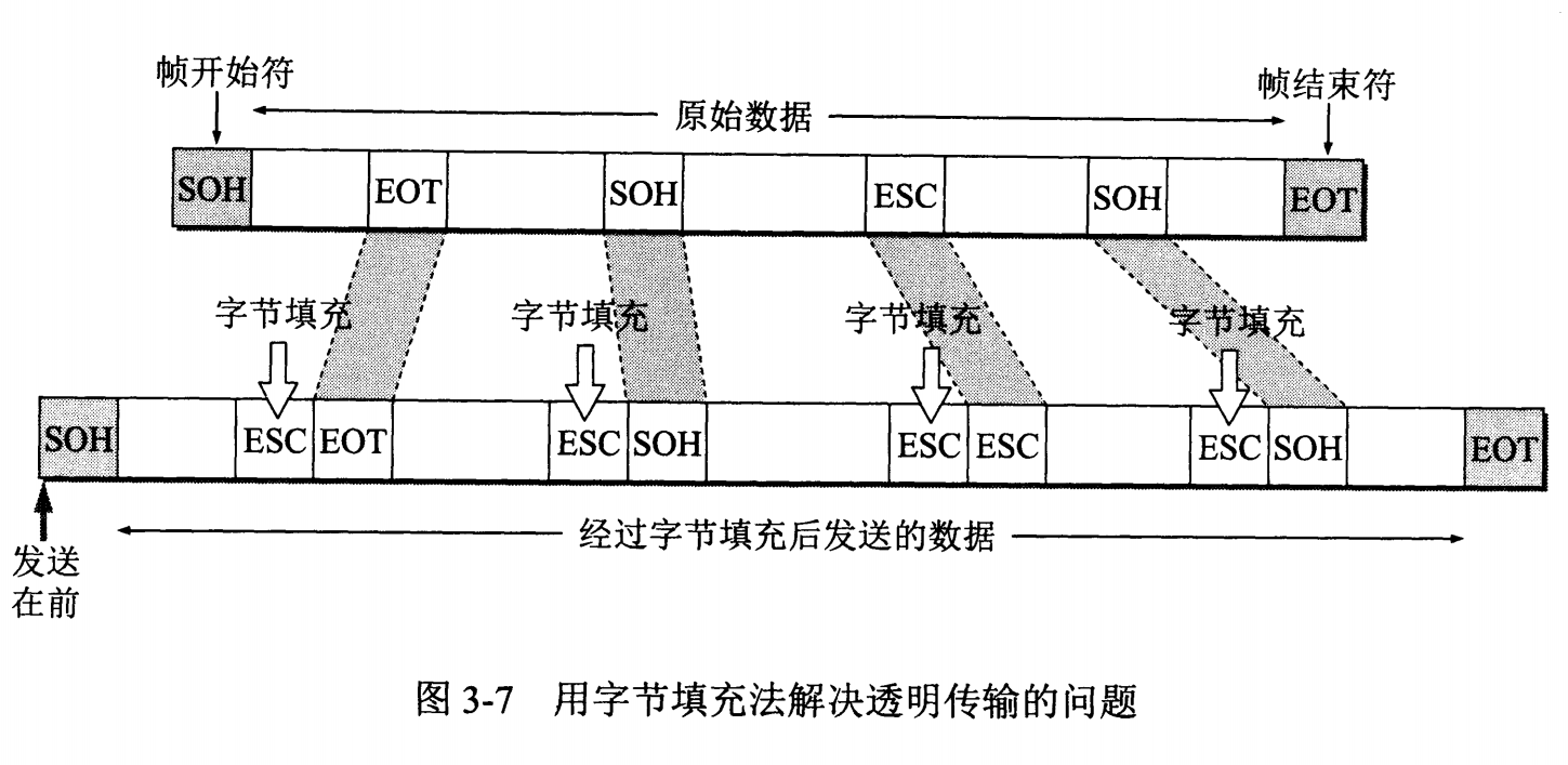 为了解决透明传输问题,就必须设法使数据中可能出现的控制字符SOH和EOT在接收端不被解释为控制字符。具体的方法是:发送端的数据链路层在数据中出现控制字符SOH或EOT的前面插入一个转义字符ESC(其十六进制编码是1B,二进制是00011011)。而在接收端的数据链路层在把数据送往网络层之前删除这个插入的转义字符。这种方法称为字节填充(byte stuffing)或字符填充(character stuffing)。如果转义字符也出现在数据当中,那么解决方法仍然是在转义字符的前面插入一个转义字符。因此,当接收端收到连续的两个转义字符时,就删除其中前面的一个。下图表示用字节填充法解决透明传输的问题。