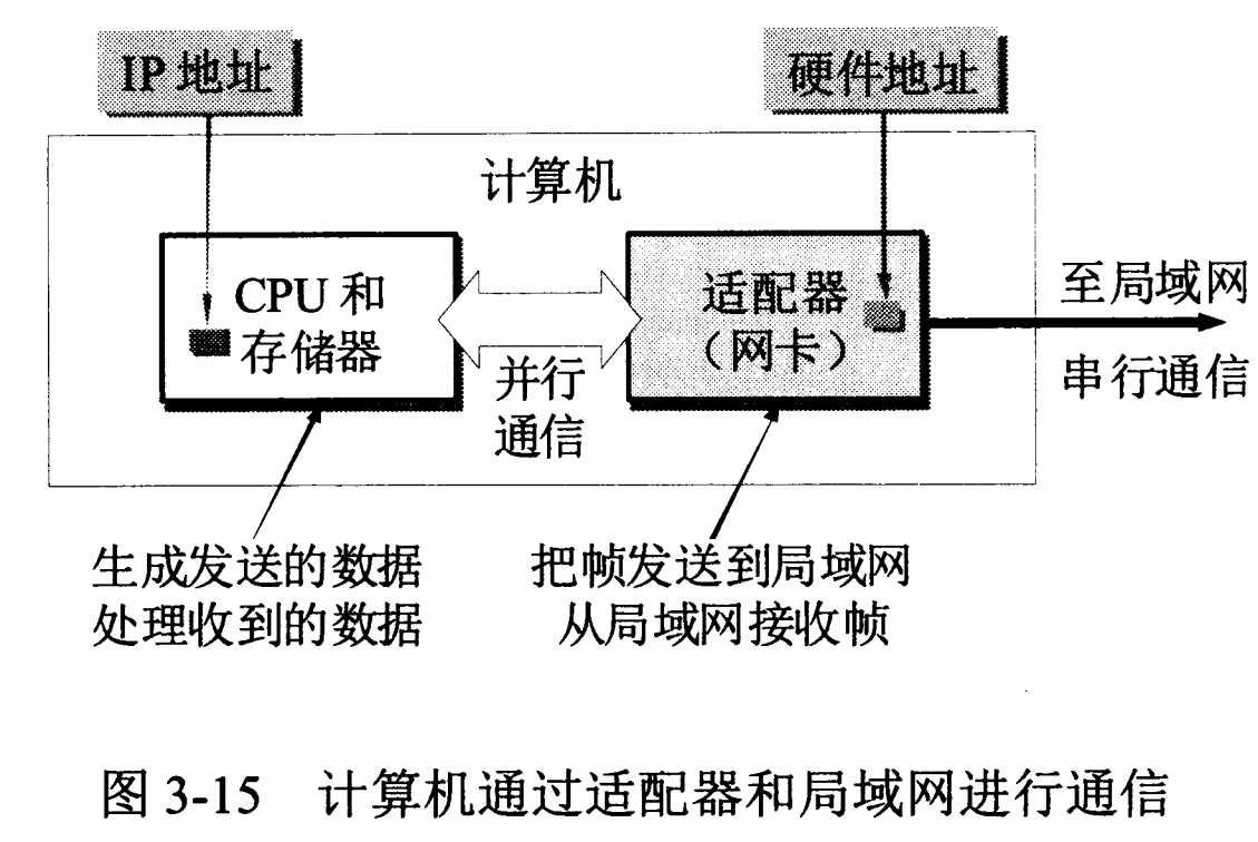 TCP/IP体系经常使用的局域网只剩下DIX Ethernet V2而不是IEEE 802.3标准中的局域网,因此之前IEEE 802委员会为了使数据链路层能更好地适应多种局域网标准而制定的逻辑链路控制子层LLC(即IEEE 802.2标准)的作用已经消失了,很多厂商生产的适配器上就仅装有MAC协议而没有LLC协议。后面在介绍以太网时就不再考虑LLC子层。这样对以太网工作原理的讨论会更加简洁。适配器的作用