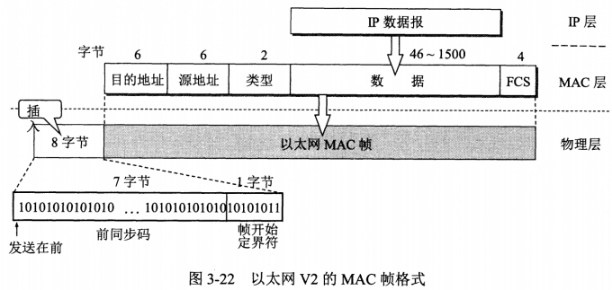 0x0800时,就表示上层使用的是IP数据报。若类型字段的值为0x8137,则表示该帧是由Novell IPX发过来的。第四个字段是数据字段,其长度在46到1500字节之间(46字节是这样得出的:最小长度64字节减去18字节的首部和尾部就得出数据字段的最小长度)。最后一个字段是4字节的**帧检验序列**FCS(使用CRC检验)。当传输媒体的误码率为1x10^-8时,MAC子层可使未检测到的差错小于1x10^-14。从上图可看出,在传输媒体上实际传送的要比MAC帧还多8个字节。这是因为当一个站在刚开始接收MAC帧时,由于适配器的时钟尚未与到达的比特流达成同步,因此MAC帧的最前面的若干位就无法接收,结果使整个的MAC成为无用的帧。为了接收端迅速实现位同步,从MAC子层向下传到物理层时还要在帧的前面插入8字节(由硬件生成),它由两个字段构成。第一个字段是7个字节的前同步码((1和0交替码),它的作用是使接收端的适配器在接收MAC帧时能够迅速调整其时钟频率,使它和发送端的时钟同步,也就是“实现位同步”(位同步就是比特同步的意思)。第二个字段是帧开始定界符,定义为10101011。它的前六位的作用和前同步码一样,最后的两个连续的1就是告诉接收端适配器:”MAC帧的信息马上就要来了,请适配器注意接收”。MAC帧的FCS字段的检验范围不包括前同步码和帧开始定界符。顺便指出,在使用