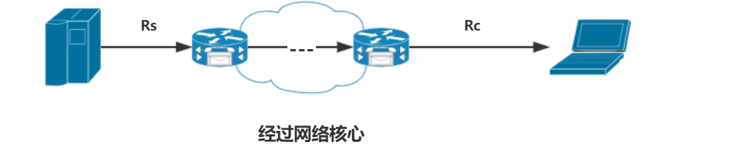 在上一例的基础上连入网络,即使在网络核心中所有链路的传输速率都远远高于Rs和Rc,但最终吞吐量仍然是Rs和Rc的最小值。