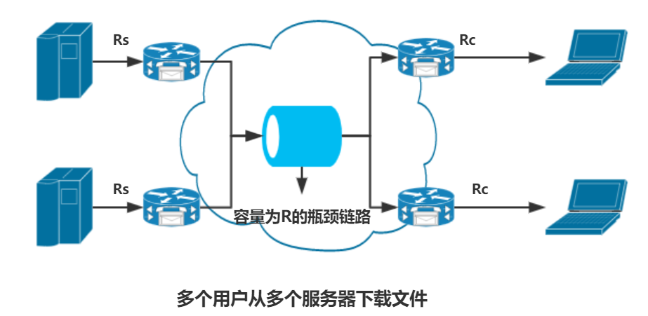 R与Rc,Rs拥有相同数量级时,假设现在两个用户从两台服务器上下载文件,Rs=Rc=2 Mbs,R=3 Mbs,这时两个下载平等划分传输速率R,R/2<min{Rs,Rc},这时瓶颈不在位于接入网,而是位于核心中的共项链路,且吞吐量为3/2=1.5 Mbs。