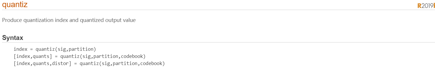 [index,quants,distor] = quantiz(sig,partition,codebook)与上述语法相同,只是distor估计这个量化数据集的均方失真。