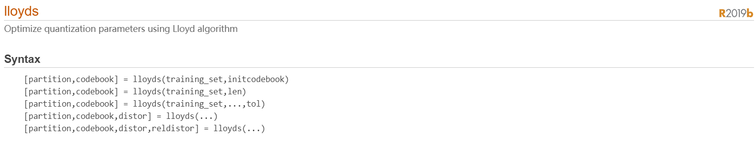 [partition,codebook] = lloyds(training_set,len) 与第一种语法相同,只是标量参数len表示矢量codebook的大小。这种语法不包括初始编码本的猜测。