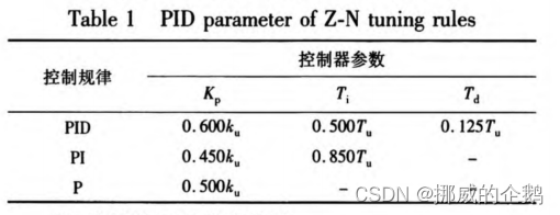 齐格勒-尼科尔斯规则是第一个提供一个的实用方法来调整PID控制器。根据该规则,一个PID控制器的调谐方法是首先将其设置为纯P模式,然后调整增益,使控制系统处于连续振荡状态。相应的增益被称为终极增益(Ku),振荡周期为振荡周期被称为终极周期(Pu)。然后,PID控制器的参数由Ku和Pu决定,使用的Ziegler-Nichols调谐表