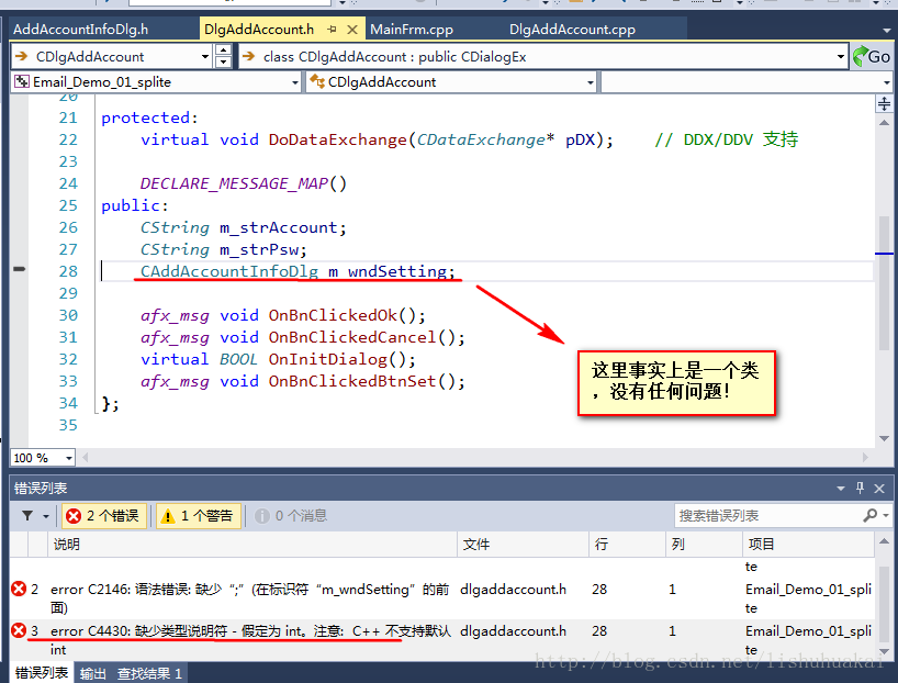 我们发现一件很有趣的事情,两个文件互相包含,这样的话,我们将AddAccountInfo.h中的#include "DlgAddAccount.h"删除,再次编译: