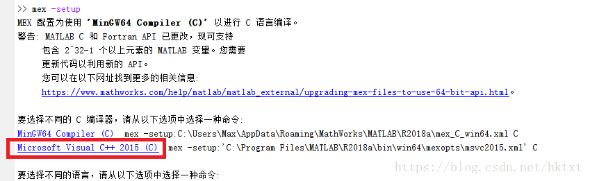 如此,可解决mex错误问题,再运行mex -setup,它会提示: