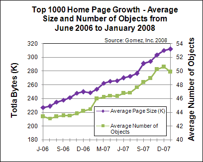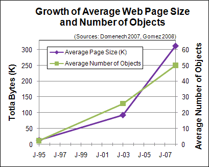 据统计,从2003年以来,网页的平均体积已经增长了三倍。从2003年到2008年,网页的平均体积从93.7K增至312K,增幅233%。同时,在这5年之内,网页中的平均对象数量翻番,从25.7个增长到49.9个。结合更早的数据,从1995年以来,网页平均尺寸已增长22倍,而网页中平均对象数量也增长了21.7倍。