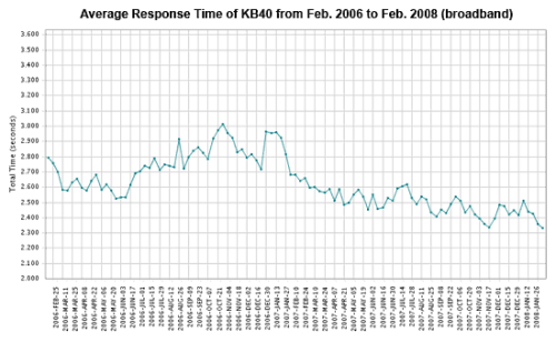 从2003到2008,窄带用户(56K Modem 与 ISDN 用户)要忍受页面响应速度迟缓越来越严重。相反,宽带用户却感受到逐渐改善的响应速度,从2006年2月的2.8秒到2008年2月的2.33秒。