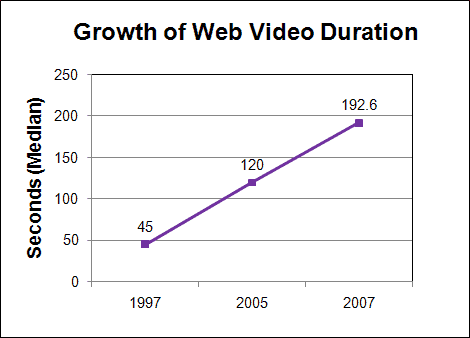 1997年,90%的视频都不超过45秒,而2005年,视频的平均长度为120秒,到了2007年,长度增长为192.6秒,视频的比特率从2005年的200K增长为2007年的328K(YouTube),因此,2007年末,视频内容的平均尺寸为63M,在YouTube,平均尺寸为10M,每天新增的视频文件为65000个。