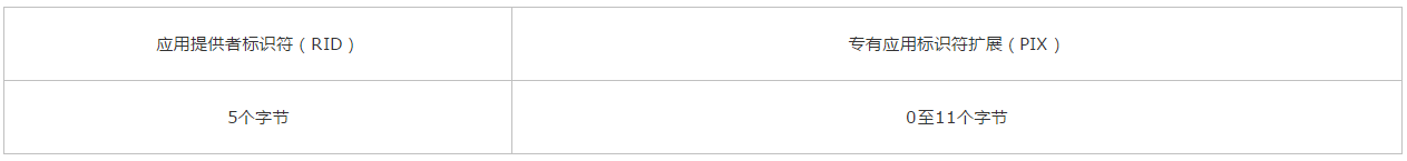 应用标识 application identifier (AID),由注册的应用提供商标识(RID)以及专用应用标识符扩展(PIX)组成。