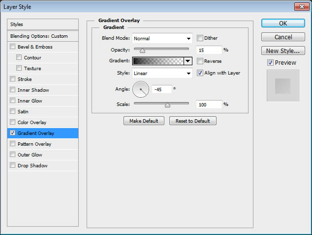 第6步 双击黑色矩形的图层应用一个渐变叠加效果。首先选择一个黑色到透明的渐变。然后,改变角度为-45,和不透明度为你喜欢的值,