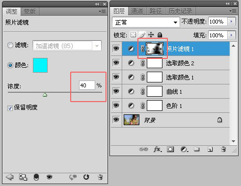 在调节层里新建滤镜,在颜色中选择一个亮黄色,暖化画面,增加画面中阳光的感觉。