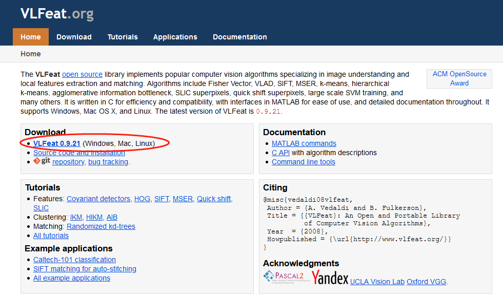 官网地址:https://www.vlfeat.org/