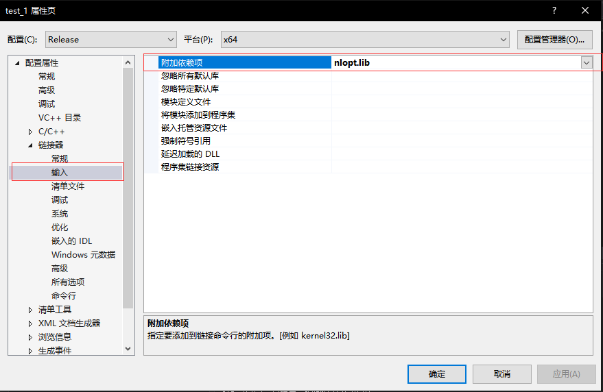 链接器->输入->附加依赖项->添加路径F:NLopttestnloptbulidRelease里面的lib文件名nlopt.lib;