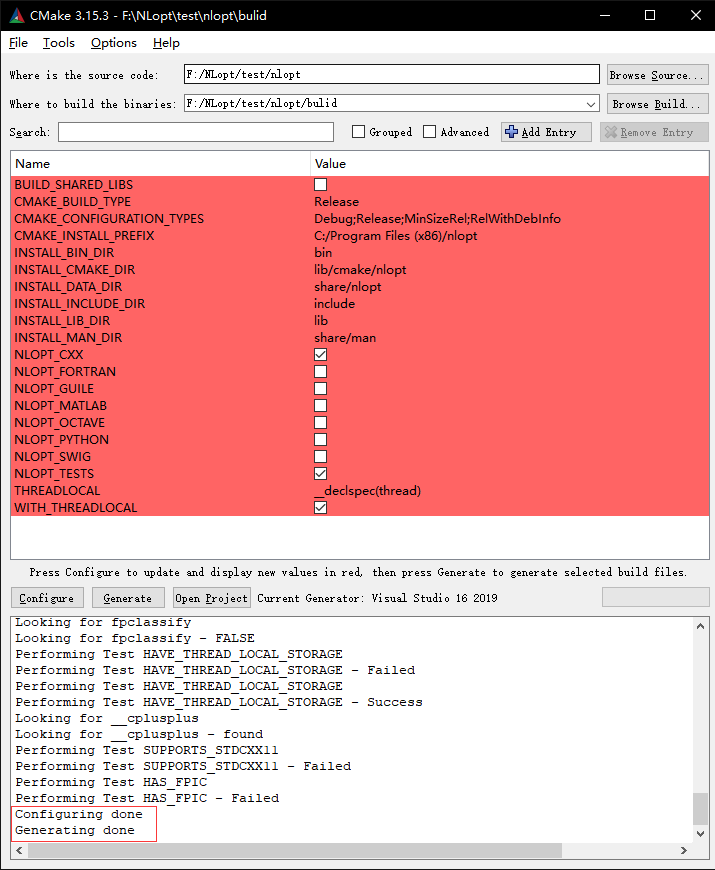 说明正常,没有问题。并且在F:NLopttestnloptbulid下会生成Release文件,里面有nlopt.lib。