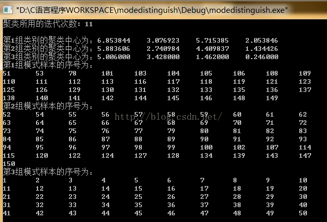 利用K-均值算法将150个模式样本分成3类别。分别计算最后算法所用的迭代次数,最终聚类中心以及每个类别中对应模式样本的序号。