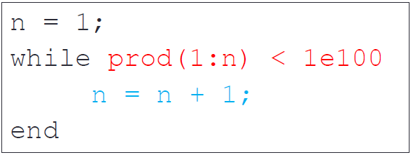 - while 循环语句:1:n = [1,2,3...n] --> prod(1:n) --> 数组元素的乘积,即阶乘。