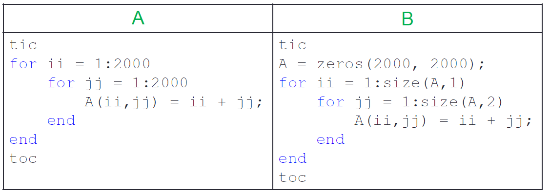 - 程式效率对比:tic ... toc 计算程式执行时间。 B先声明了内存空间,A未先声明。