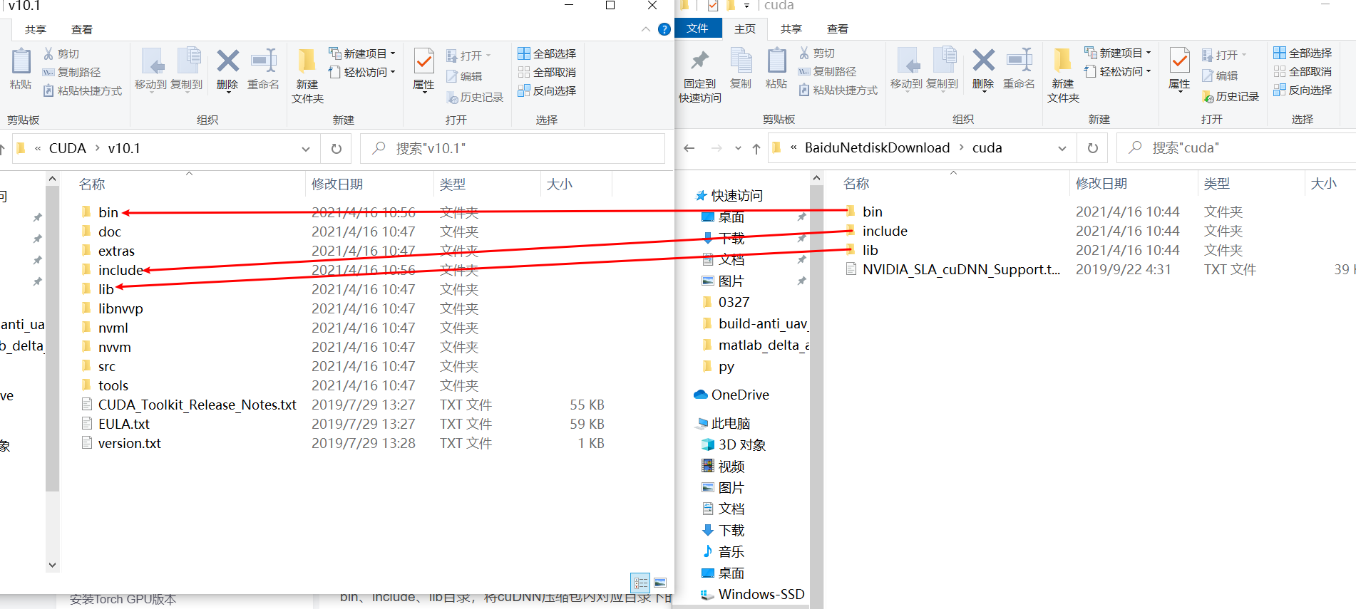 将cudnn的三个文件夹直接复制到如图所示的CUDA文件夹下即可