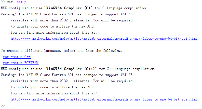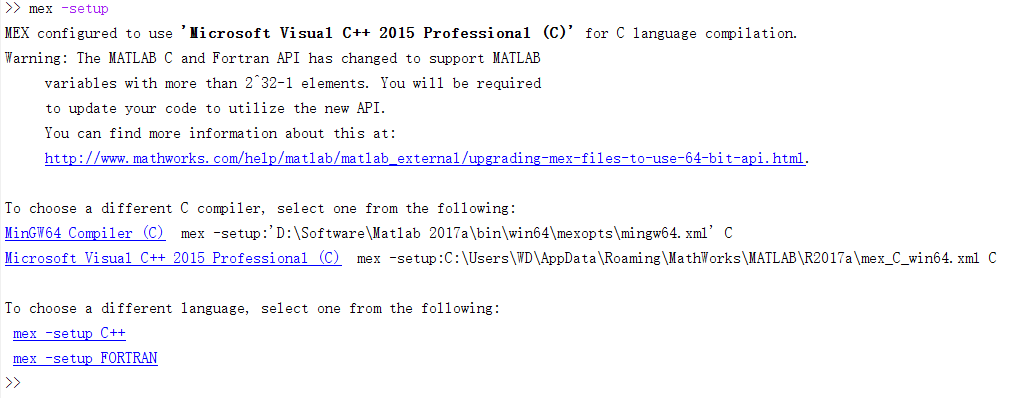 3. >>mex -setup,此时你的编译器会变成“Microsoft Visual C++ 2015”,同时也可以选择MinGW64 Compiler