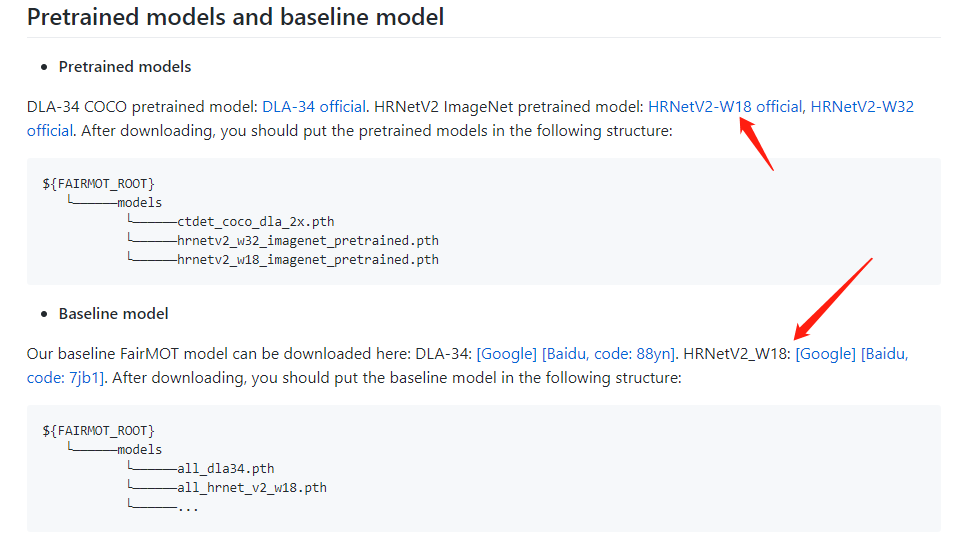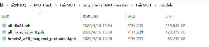 下载github上的代码:https://github.com/ifzhang/FairMOT 以及 预训练模型,这里我下载了HRNetV2-W18网络的预训练代码,因为DLA网络用到了DCN v2,这个需要提前编译,但是我这里编译失败了,作者说编译失败可以用HRNetV2-W18这个网络。模型下载完毕按照提示放在项目根目录下的models文件夹下