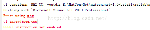 只看这两部分感觉摸不着头脑。不知道SSSE3是什么鬼,只能看出是编译vl_imreadjpeg出了问题。