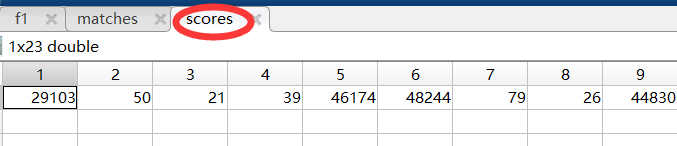 scores是上面matches到的对应点的欧式距离,后面的scoreind是对欧式距离按由小到大进行排序,储存的是距离对于的序号
