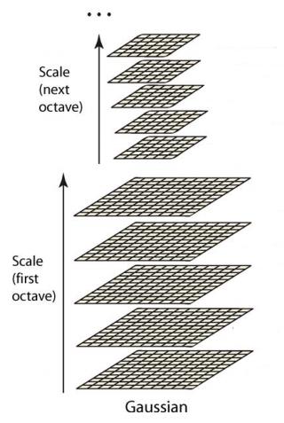 每一组中每层采用不同的高斯模糊核,下一组由 上一组进行下采样得到。