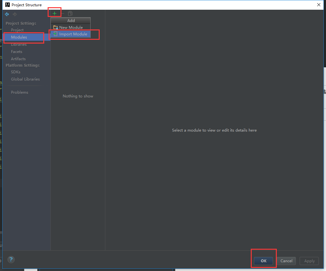 5.选择【Modules】→ 点击【+】号 →选择【Import Module】→ 弹出添加项目的窗口,选择你需要添加的项目,点击ok (这一步就是在往项目空间里添加项目)