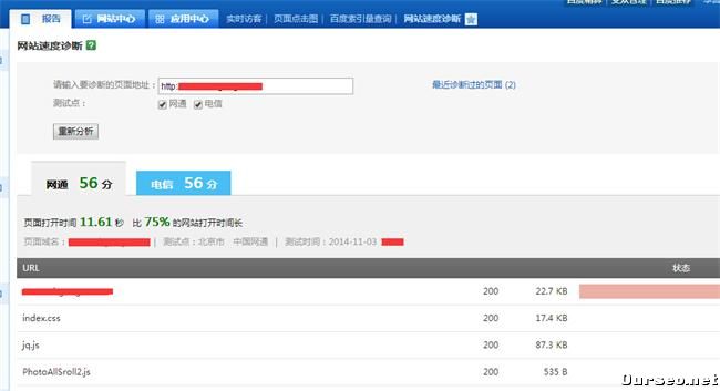 今天在登陆百度推广后台后,发现优化建议里面有一条提示,网站打开速度慢,达到7秒。想一下有多少网民愿意等待7秒呢,没耐心的都直接关闭你的网站。这个流失率不小啊。于是我就按照提示用百度的那个网站速度诊断工具,测试一下,网通和电信都显示得分56: