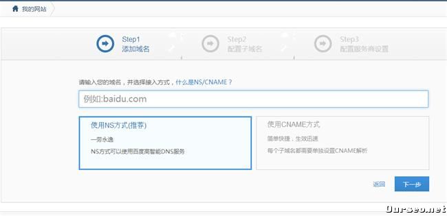 进入网站,然后添加网站。这里也有两种接入方式:NS/CNAME方式,我自己使用的是NS验证的方式,因为感觉这个方便点,能使用百度各机房节点的DNS高智能服务,同时也是百度推荐使用的接入方式。