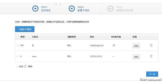 然后进入下一步,配置子域名;这里默认的有一个MX记录,还有一个A记录;在这里需要检查的是指向IP地址是否是你空间上的那个IP,接下来增加一个@记录A指向的,这样无论是带三个W的还是顶级域名都会指向同一个页面地址,方便搜索引擎统一认识啊!