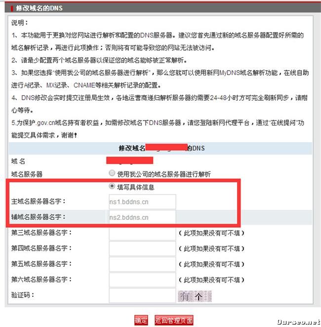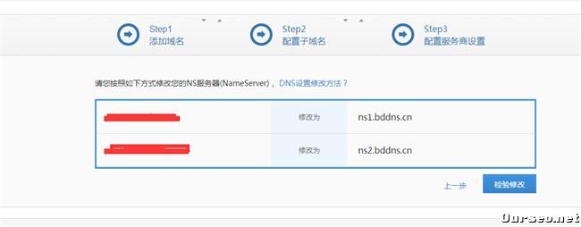 其次,配置服务商设置。在这里需要去你的空间管理那边,把原先的那个DNS地址修改一下,改为百度的ns1.bddns.cn和ns2.bddns.cn;这两个缺一不可的。在这里我就演示一下新网的修改方法,登陆新网管理那边,修改域名DNS地址,然后确定就修改成功了。修改成以后,回到百度云刚才那个页面,检验修改就大功告成了,是不是挺容易的呢?具体的可以看一下下面的图;