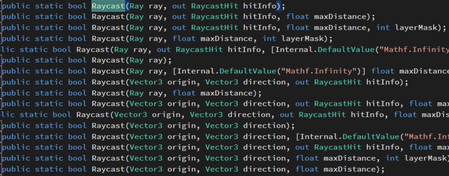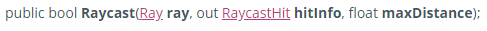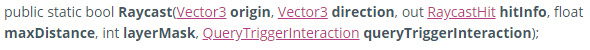 Raycast(光线发射)的重载函数有15个,最多可有6个参数。