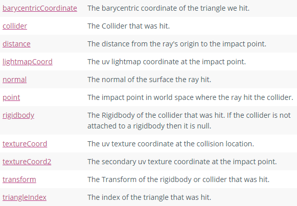 RaycastHit(光线接触)存储了光线发射的所有信息。