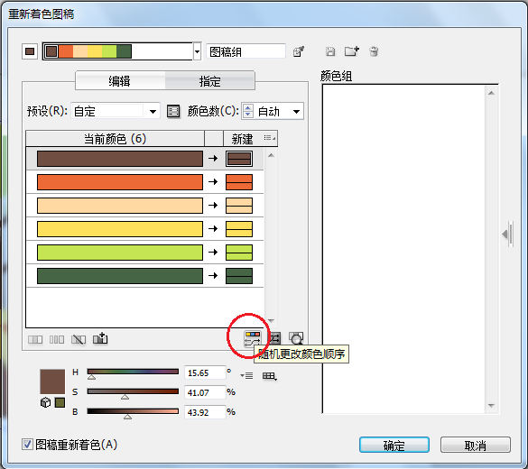 使用的软件工具是Adobe Illustrator,在进行减色的操作时,AI相比于PS再次显示出强大的优势。减色的原则是优先减去使用面积较少的颜色,方法是用一种已用颜色取代另一种已用颜色(不过有例外情况,比如皮肤的颜色面积不大,但是既减不掉又没法替换成)。减的过程中注意不同形状之间的颜色区分度。实在没思路减不下去的时候可以利用重新着色图稿工具里的“随机更改颜色顺序”(如下图),有时会柳暗花明地发现一种颜色可以被另一种已用颜色代替,从而将原本占面积较大的颜色变成了占面积较少的颜色,进而可以被进一步去掉。