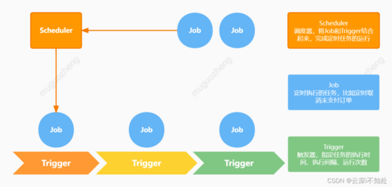 Scheduler:调度器,将Job和Trigger组装起来,使定时任务被真正执行;