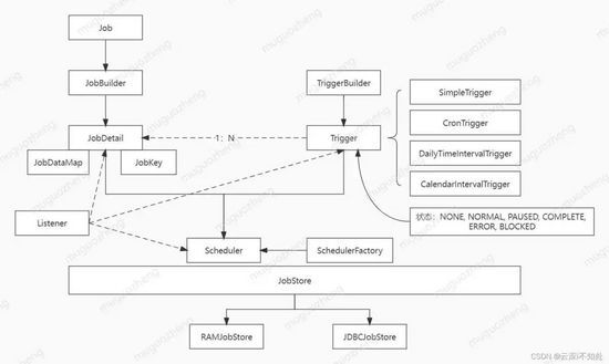 Trigger:触发器,定义定时任务的触发规则,包括执行间隔、时长等,使用TriggerBuilder创建,JobDetail和Trigger可以一对多,反之不可。触发器可以拥有多种状态。
