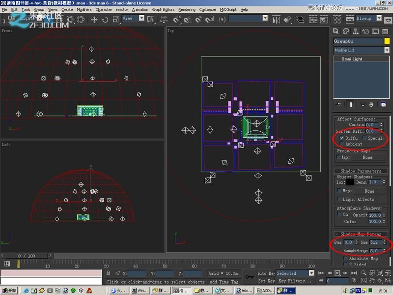 我用的是球形光,其实道理很简单,在天空下,光的漫反射是无序的,也就说天光是很均匀的反弹到建筑上,所以球形光比较适合。因为是建筑效果图,背面看不到,所以我把背面的灯光和下面的灯光都省略不计,适当的减少了灯光的数量。
